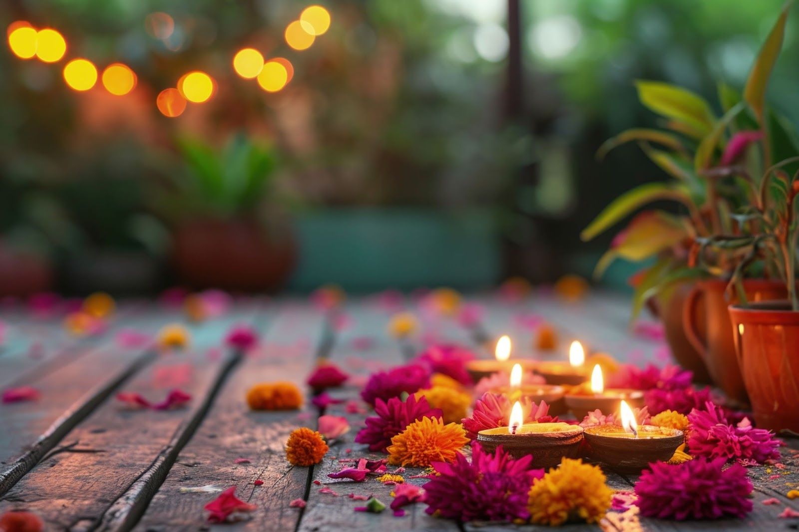 - Accent: Diyas or LED candles at the base of plants to highlight shapes and create shadows.