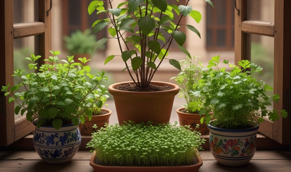 Coriander, Mint, Tulsi, Fenugreek, and Curry Leaf all adapt nicely to windowsill or balcony conditions. Just make sure they get at least a few hours of indirect sunlight each day.
